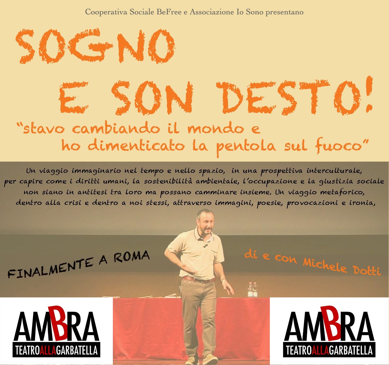 Il 13 Aprile 2015 alle ore 21:00 c/o il Teatro Ambra di Garbatella a Roma, va in scena “Sogno e son desto! Stavo cambiando il mondo e…ho dimenticato la pentola sul fuoco”, di e con Michele Dotti, organizzato dalla Cooperativa Sociale BeFree e dall’Associazione Io Sono con il patrocinio del Municipio VIII di Roma.
