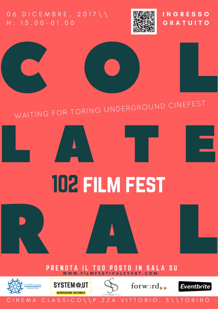 Mancano solo due giorni alla prima edizione del Collateral 102 Film Fest, partner del più blasonato Torino Underground Cinefest. La kermesse cinematografica sarà infatti in scena il 6 dicembre 2017, dalle ore 13.00 alle ore 01.30 del 7 dicembre, presso il Cinema Classico, sito in p.zza Vittorio, 5 a Torino, promossa da SystemOut e A.C.S.D. ArtInmovimento, sotto la direzione artistica del regista indipendente Mauro Russo Rouge.