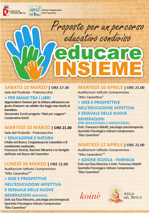 Partirà il prossimo 10 marzo a Pratovecchio Stia l’iniziativa denominata “Educare Insieme”, promossa dall’Amministrazione Comunale e dall’istituto Comprensivo Alto Casentino, con il coinvolgimento di Koinè e dell’Asilo nel Bosco del Casentino. Si tratta di un ciclo di cinque incontri, che terminerà il 17 aprile, rivolti a tutti e a tutte e in particolar modo alle famiglie che usufruiscono dei servizi scolastici e educativi, dall’asilo nido alla scuola secondaria di primo grado. Lo scopo di questi momenti è creare un confronto allargato a tutti i soggetti che nel Comune offrono un progetto di crescita, al fine di elaborare un percorso educativo condiviso da parte della società civile, del mondo scolastico e istituzionale.