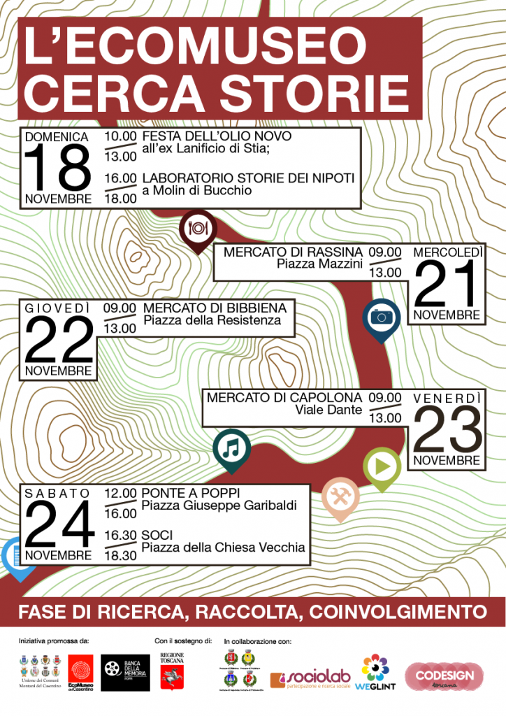 La prima fase di questo programma si sviluppa intorno a tre parole chiave – Ricerca, Raccolta, Coinvolgimento – ed ha l’obiettivo di intercettare gli abitanti e iniziare con loro un processo di attualizzazione dell’identità e del racconto del territorio del Casentino. Con il supporto metodologico di Sociolab, Cooperativa che si occupa di processi partecipativi e ricerca sociale e Codesign Toscana, associazione attiva nella co-progettazione e nell’innovazione sociale, l’Ecomuseo propone attività per valorizzare il territorio attraverso il vissuto di vecchi e nuovi abitanti – aneddoti, leggende, ricordi, ricette, momenti e luoghi degni di nota, etc… – con videointerviste, una postazione per la coprogettazione creativa di storie e raccolta di testimonianze per costruire una mappatura narrativa e generativa che sappia metterne in luce aspetti inediti e curiosità preziose.