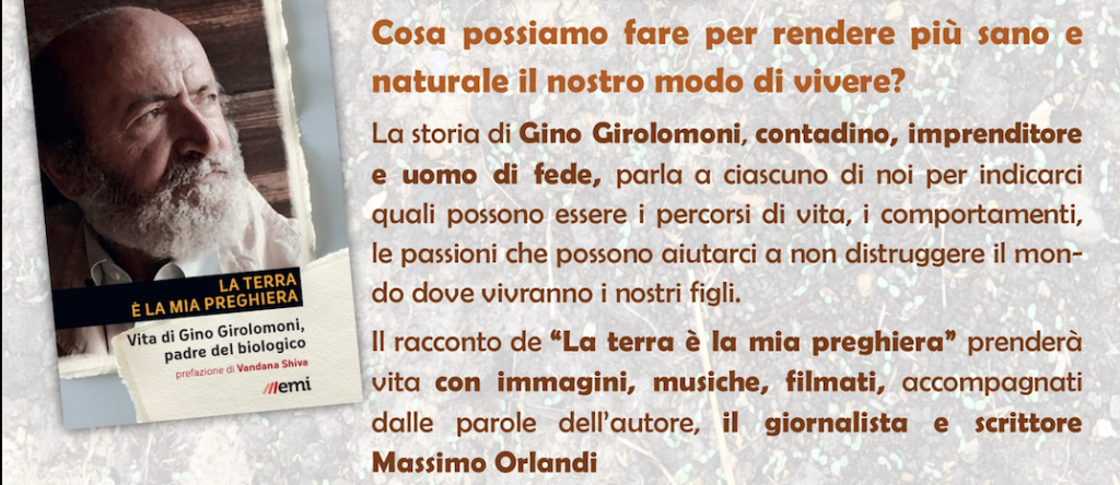 Orlandi ha scritto la biografia di Gino Girolomoni, ma in questa occasione “La terra è la mia preghiera”, titolo del libro, diventerà un racconto orale arricchito di immagini, musiche, testimonianze, letture.