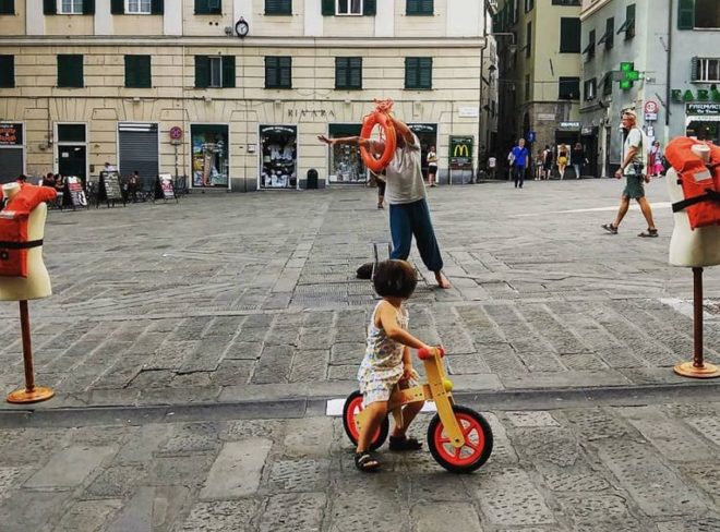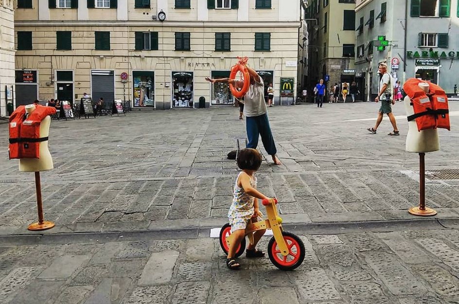 Genova è stata la tappa in cui Arianna e Innocenzo hanno avuto conferma che la loro performance, pur nella sua semplicità, era capace di comunicare e di muovere un forte campo: tanto da incuriosire una decina di bambini per oltre mezz’ora. O ancora – da portare un leghista a donare 20 euro e a dir loro “in mare si salva sempre”.
