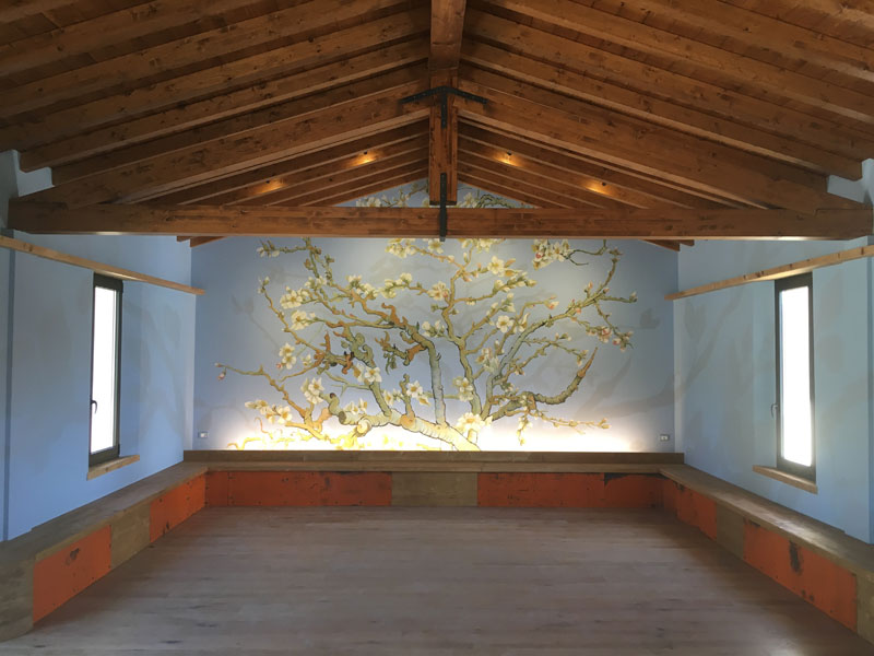 Si tratta di uno dei nuovi luoghi d’incontro che abbiamo realizzato: è una sala completamente affrescata che riproduce i rami del mandorlo in fiore di Vincent Van Gogh. L’effetto è particolare: entrando nella stanza, si ha la sensazione che i rami ti abbraccino.