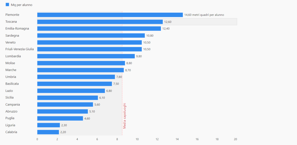 I dati disponibili mostrano che nei comuni capoluogo italiani in media ci sono circa 8,5 metri quadri per alunno. Una cifra che varia tra le diverse aree del paese. Nell’Italia centro-settentrionale il dato è più in linea con la media nazionale. Nelle scuole dei capoluoghi del nord ci sono circa 11 metri quadri di giardini scolastici per alunno. Nel centro Italia il dato è sostanzialmente in linea con quello nazionale (8,7 metri quadri).