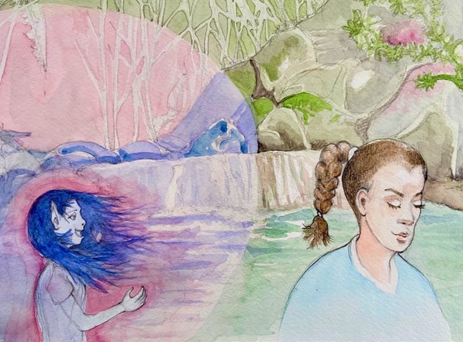 E nell’attesa andò nel suo luogo preferito, che aveva soprannominato il “Mio Posto Magico”: una cascata avvolta da un bosco fitto rendeva quell’angolino unico e protetto da sguardi poco attenti sia dal mondo degli esseri elementali in cui lei viveva, che da quello degli umani: due universi sovrapposti creati per potersi sfiorare, ma mai toccare.