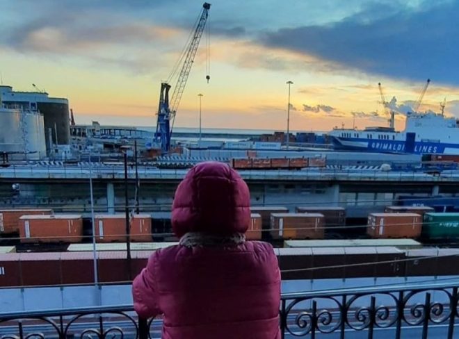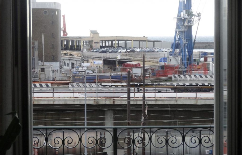 Dalle abitazioni di chi vive in Lungomare Canepa per, questa è la vista (vedi foto sotto): la grande gru blu individua l’inizio del molo, mentre i pilastri del capannone poco più indietro si collocano a metà dello stesso molo. La prossimità di balconi e parapetti domestici rispetto all’area portuale quindi è evidente.