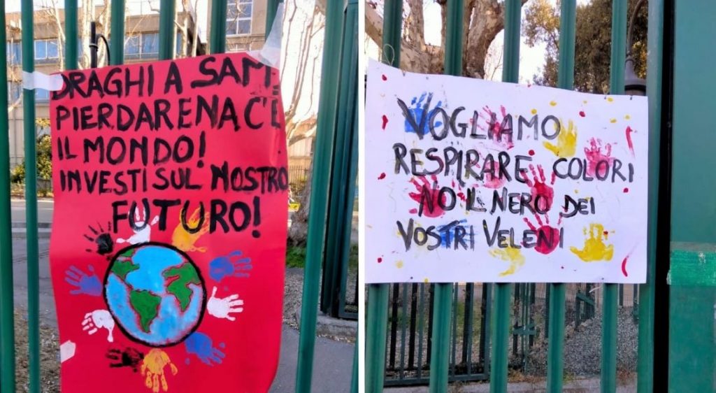 Mercoledì mattina, intorno alle 10, alcune insegnanti e mamme del comitato, una volta appresa la notizia dell’imminente passaggio del corteo presidenziale, coinvolgendo i bambini hanno deciso estemporaneamente di realizzare ed esporre alcuni cartelli, agganciati poi alle cancellate dei giardini Pavanello, affinché fossero visibili dai finestrini dell’auto di Draghi. L’obiettivo era rendere nota al presidente la posizione di molte delle persone che vivono a Sampierdarena nei confronti dell’insediamento dei depositi chimici nel quartiere (di cui abbiamo parlato qui).