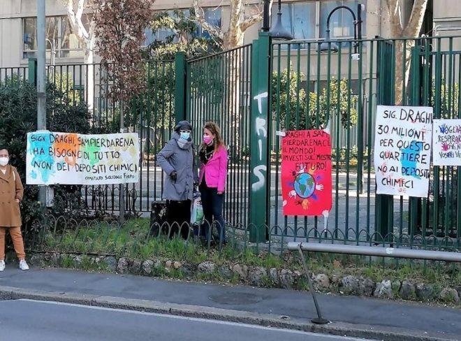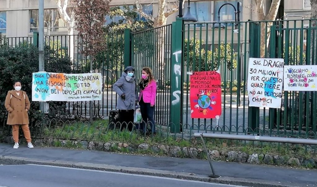 Mercoledì alcune insegnanti e mamme di un comitato di quartiere, il Comitato Firpo, hanno esposto dei manifesti realizzati insieme ai bambini per esprimere la propria vicinanza a una battaglia territoriale molto sentita, ovvero lo spostamento dei depositi chimici presso l’area portuale di Ponte Somalia. Le donne, per tutta la durata della visita di Mario Draghi presso la Radura della Memoria, sono state trattenute da agenti della DIGOS, i quali hanno staccato i cartelli dalla cancellata e verificato i documenti di tutti i presenti.