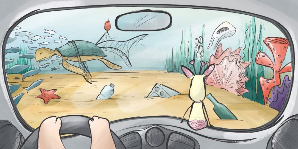 Innanzitutto i due autori, Simone Morini e l’educatrice ambientale Valentina D’Amora, dopo avermi raccontato quello che avevano in mente, mi hanno fornito quello che potremmo definire un “copione” di tutte le scene. Abbiamo condiviso da subito la scelta di realizzare ogni illustrazione dal punto di vista della piccola protagonista, proprio per coinvolgere in prima persona il lettore in questo viaggio immaginario dall’abitacolo della sua auto. Insieme a lei voliamo con la fantasia, imbattendoci in scenari che fanno ormai parte del nostro quotidiano, come i rifiuti in spiaggia o in montagna, i panorami che si modificano per effetto del cambiamento climatico.