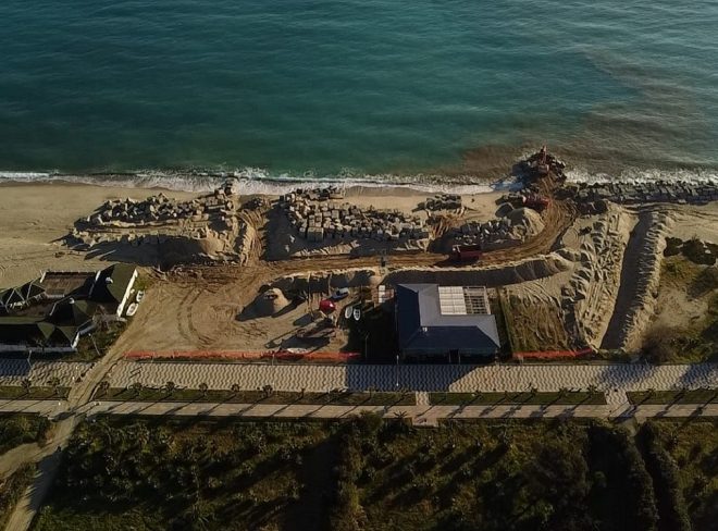Il progetto “Waterfront” di Soverato è stato redatto nell’anno 2019 e prevede ben otto pennelli [strutture artificiali situate a ridosso delle coste per proteggere i litorale, ndr] di cui 7 a “T”, e una barriera emersa di ben 120 metri di lunghezza per 55 di larghezza, posta in contiguità dell’area archeologica costiera della località San Nicola. A queste opere è associato il progetto del porto turistico.