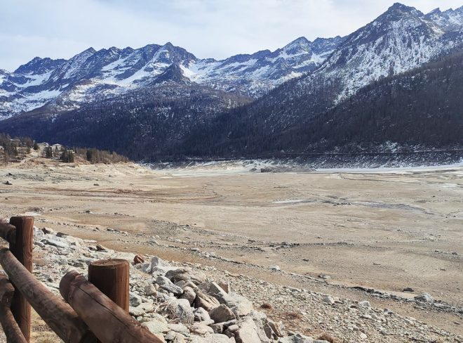Alcuni lo hanno associato a un deserto, altri a un paesaggio lunare: quello che è certo è che l’assenza di pioggia ha svuotato laghi e fiumi, mettendo in crisi diverse centrali idroelettriche. Lo bacino del Lago di Ceresole infatti, normalmente convoglia acqua destinata alla produzione di energia idroelettrica, ma l’aspetto ancora più critico e allarmante è che le stesse montagne alpine localizzate sopra al lago sono completamente svuotate dalle neve.