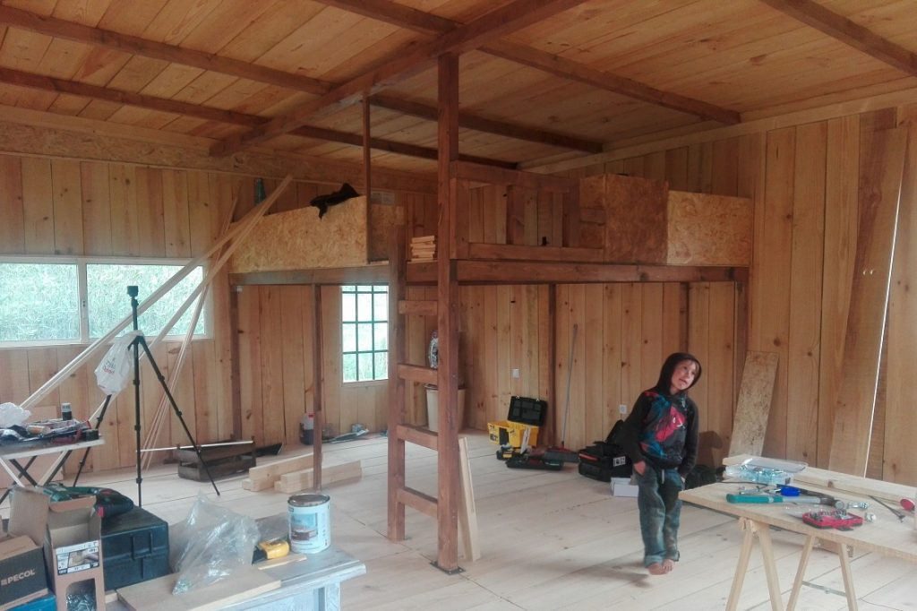 Dopo tre mesi di lavoro, errori e aggiustamenti, piccoli cambiamenti del progetto in corso d’opera, installazione dell’impianto elettrico e dei tubi idraulici, la struttura era pronta per essere arredata. Avendo deciso di ridurre al minimo gli sprechi di materiale, sia per una questione economica che ecologica, anche l’interno è stato in gran parte costruito con le nostre mani – io dico nostre ma soprattutto da quelle di Tomas.