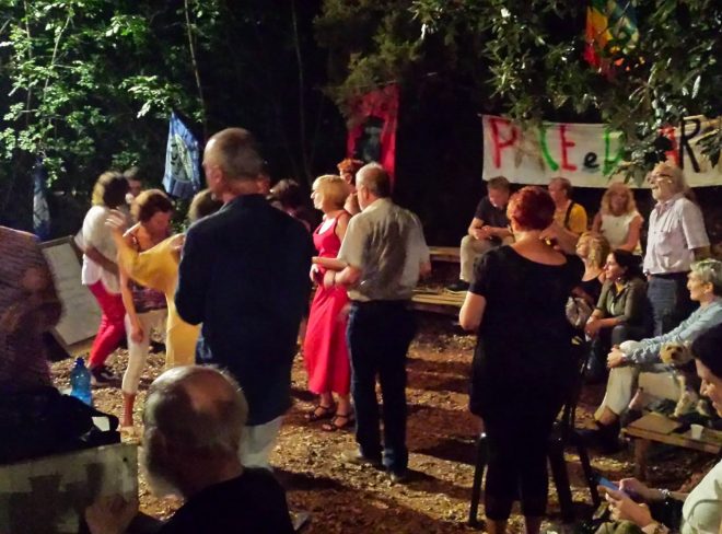 Di fronte alla sede una stradina porta ad un piccolo anfiteatro autocostruito dai soci della casa, con davanti un palco. Il tutto è in legno ed è circondato dal bosco. Ed è qui che vengono organizzati spettacoli teatrali, riunioni, incontri serali. Ma anche cene a tema, tra cui la Spaghettata antifascista, in commemorazione di eventi del passato, organizzata per ricordare ed evitare di ricommettere gli stessi errori nel futuro. Chiedo a Luigi come vede il futuro, e la risposta mi inquieta: