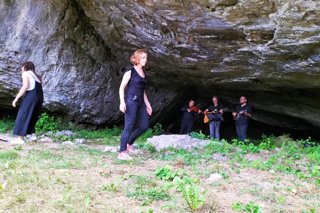 Giungiamo così all’ultima tappa: una musica ci aiuta a comprendere la direzione. Ed è così che arriviamo di fronte a una grande grotta, al cui interno c’è un trio che con chitarre e violino detta l’atmosfera sempre più frizzante e imprevedibile di questo spettacolo. Alla fine della performance, che ha lasciato tutti a bocca aperta, ho l’occasione di incontrarne i protagonisti. Ed è così che conosco le attrici e i musicisti che compongono la compagnia musico-teatrale Le mani e le nubi, che dal 2017 scrive e organizza spettacoli in giro per il savonese e non solo.