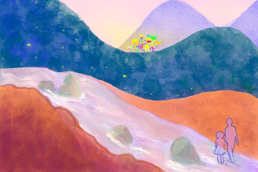 Dopo aver mangiato pane di segale e frutta secca assieme agli abitanti del villaggio, Kukì ripartì assieme a Gapi, una bambina dal sorriso bianco come una conchiglia. I due camminarono per un giorno intero e verso sera arrivarono in una radura in cui il fiume sembrava scomparire all’interno di una collina. Il cielo iniziava a farsi scuro come gli occhi di un gufo, perciò Gapi disse: