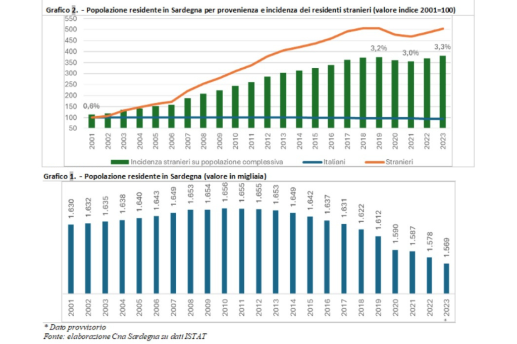 Dal 2001 a oggi la Sardegna ha perso oltre 100mila abitanti. Questo perché da anni il numero dei decessi supera di gran lunga quello delle nascite. È una spirale senza fine e il fenomeno oggi sarebbe ancora più imponente se, in parallelo, non si assistesse a un incremento costante degli stranieri che vivono nell’isola. Da questo punto di vista i numeri parlano da soli e sono ben illustrati da un report stilato dal Centro studi della Cna, la Confederazione nazionale degli artigiani e della piccola e media impresa.