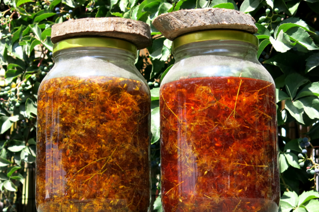 Di giorno si espone alla luce del sole e di notte si tiene al coperto, mescolando di tanto in tanto. L’ultimo giorno si filtra e si conserva in contenitori di vetro scuro. L’olio ottenuto, chiamato Ollu arrubiu, Olio rosso o Olio di San Giovanni, viene utilizzato come prodigioso medicamento contro le bruciature ma anche come antidolorifico locale in caso di traumi lievi o malattie croniche che riguardano muscoli e arti, nonché per medicine tradizionali esorcistiche in formula di pratica chiusa.