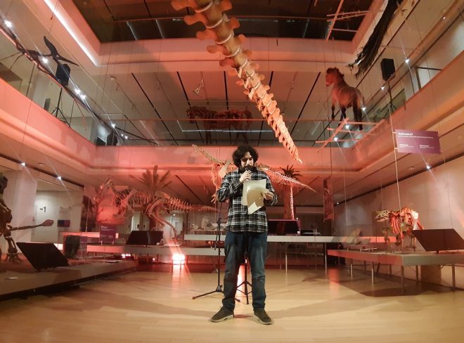 Io me li immagino quei poeti a scriver versi sotto allo scheletro di un dinosauro, tra orme fossili e tracce di rettili paleozoici. E poi arriva il momento più divertente, lo scopo di tutto questo percorso: Poetry for the planet!, un evento di poetry slam in cui gli artisti si sfidano con le armi delle loro parole davanti a un pubblico che interagisce, vota e decreta un vincitore. E, ne sono sicura, esce un po’ diverso da come è entrato.