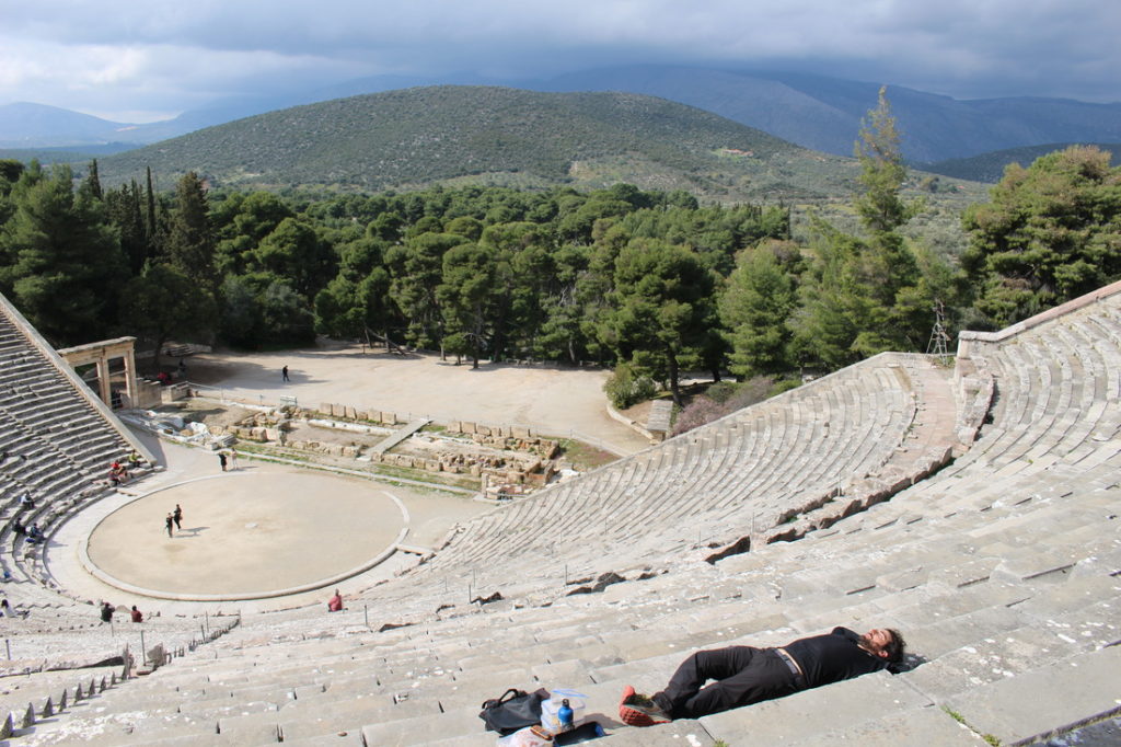 Si sale dolcemente fino all’antico teatro di Epidauros. Una meraviglia incastonata tra le montagne. E che acustica! Su consiglio di mia madre, venuta 19 anni fa, lascio cadere una monetina sulla pietra centrale e Marco, seduto sull’ultimo gradone in alto, sorpreso, sente perfettamente il tintinnio metallico. Restiamo a lungo a goderci questo luogo mentre vanno e vengono scolaresche da tutto il mondo. La giornata è splendida, ci concediamo un riposino al sole sui grandi scalini del teatro.