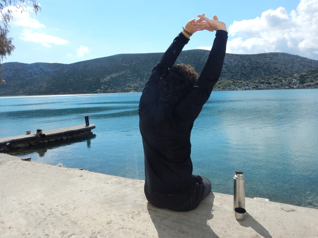 Virginia, Giorgos e l’amico Antony, conosciuti la sera prima, all’interno del loro kafenios Argos, nell’ultimo tentativo di trovare una soluzione alternativa alla spiaggia, ci hanno procurato un alloggio, dato una cartina e anche uno zaino : non ci manca nulla per iniziare il nostro trekking. Le strade secondarie segnate sulla mappa sono degli ottimi sentieri di strada battuta, avanziamo a passo rapido. Dall’alto abbiamo subito la percezione della morfologia di quest’isola che assomiglia ad una farfalla con le ali spiegate. Colline verdeggianti, le solite caprette, cassette di api qua e là e raggiungiamo la nostra meta che abbiamo ancora qualche ora di luce.
