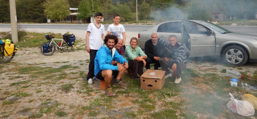 Dopo tre giorni di ascensione conquistiamo il colle di Alacabel a 1825mt! Record d’altitudine raggiunto in bici. Come una ricompensa una coppia di turchi, che si era fermata per delle foto, ci offre dei biscotti al sesamo nero…non potevamo sperare meglio, non abbiamo più niente da mettere sotto i denti e il prossimo villaggio è ancora lontano. Il panorama è sbalorditivo, ci sentiamo piccoli in mezzo a questi alti rilievi. Pronti per la discesa ci lasciamo dietro le cime innevate. Come un branco di lupi affamati cerchiamo un punto di rifornimento. Lungo la strada un’insegna indica «Ekmek Trabzon», un odore di pane appena sfornato arriva dritto alle nostre narici! 3TL per un pezzo, un po’ caro ! Di solito il pane che troviamo ovunque costa 1TL, Marco cerca di contrattare, ma niente da fare, abbiamo troppa fame, paghiamo. Iniziamo il nostro pic-nic davanti al negozio, quando, dopo un po’, il panettiere arriva e ci restituisce le 3TL, rimaniamo stupiti…Sarà il fatto di aver visto le nostre bici con tutto il loro carico? O forse per aver notato il nostro aspetto non curato (eppure l’ultima doccia risale a soli 3 giorni fa)? O per caso per aver udito le nostre bocche rumorose che apprezzavano il delizioso pane di Trabzon? Mistero….ma rinraziamo di cuore!