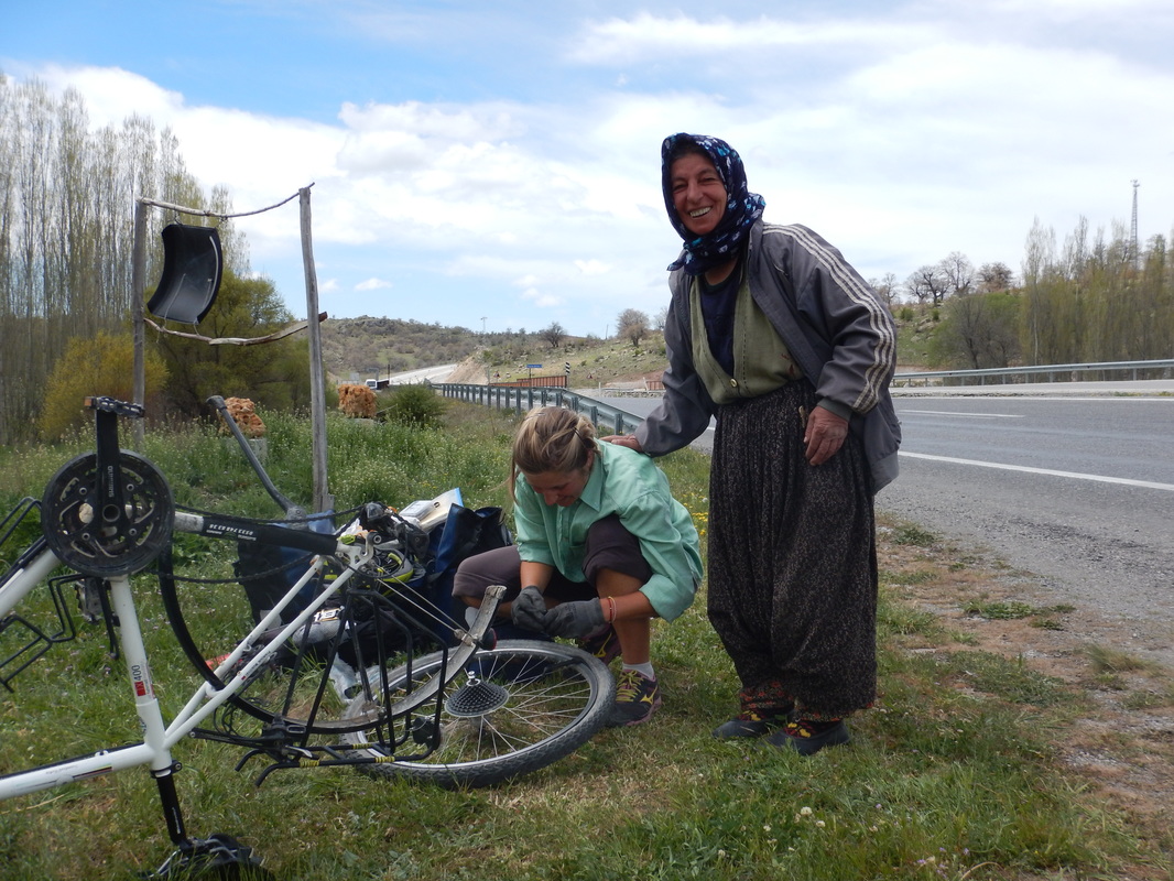 Lunedi 4 maggio, pschiiitttt….la mia seconda bucatura del viaggio, la prima è stata a Lisbona. Mentre inizio la riparazione, una signora si avvicina, e mezza sorpresa e mezza divertita indica Marco che prepara da mangiare. Ovviamente, anche se la bici è mia, è l’uomo che deve sporcarsi le mani ! Prima di ripartire ci offre del tè preparato su una bella teiera tradizionale a legna e noi condividiamo con lei i baklava. Dopo la nostra prima notte nella steppa, ci fermiamo in una stazione di benzina e qualche secondo dopo eccoci a tavola per la colazione con un gruppo di curdi che gestiscono il posto e i loro amici camionisti. Uno di loro prova la mia bici carica di bagagli, come per assicurarsi che ciò che può una ragazza può farlo anche lui…ci sono stati momenti in cui temevo stesse cadendo! Il quinto giorno, secondo le scritture, risorgiamo! (essendo lenti ci mettiamo due giorni in più di Gesù Cristo). Addio, per un po’, ad eterne salite, entriamo a Konya per una lunga ciclabile, inattesa e in leggera discesa, mi ricorda il nostro arrivo a Seviglia, che piacere!