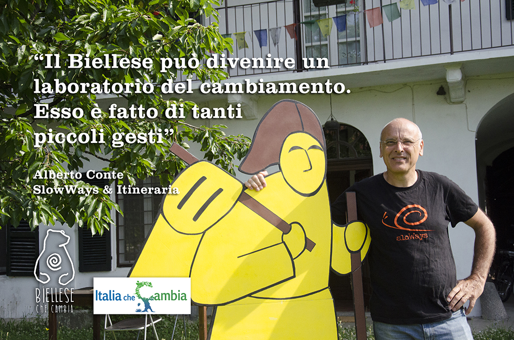 Alberto si occupa di viaggi lenti a piedi ed in bicicletta. Tutto era nato da Itineraria, un progetto nato per mappare e valorizzare i territori delle città. Per lui il cambiamento parte innanzitutto dalla propria persona e da quelle più vicine. Spera che il biellese possa divenire un laboratorio del cambiamento, un vero e proprio riferimento a livello nazionale. Ci racconta di come è partita la sua avventura nel mondo del viaggio lento, il 9 settembre 2001 proprio a pochi giorni dal disastro delle Torri Gemelle che inevitabilmente ha influito in quel periodo nel settore turistico.