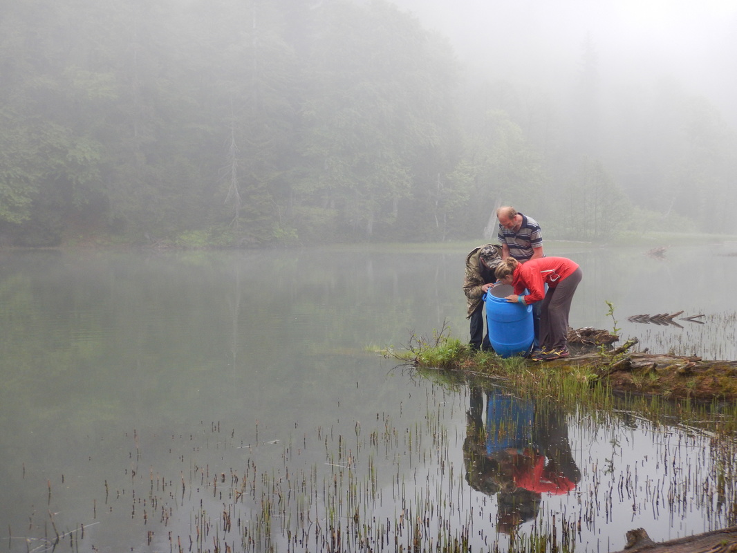 É il weekend e muniti di tute mimetiche e fucili (che dicono di aver portato solo per divertirsi a sparare alle bottiglie) si sono trasformati in grandi avventurieri in occasione di quella che oggi chiamano “la spedizione”. Hanno comprato dei pesci a Batumi e sono venuti fin qui per riversarli nel “lago nero”, nel quale a parte le sanguisughe non c’è alcuna forma di vita. Sperano di potervi ritornare tra qualche anno per pescare. Dopo aver immortalato con cellulari, telecamere e macchine fotografiche il fatidico momento, una mitragliata per celebrare e iniziano i discorsi che antecedono i brindisi. Il primo è sempre per la libertà nel mondo, poi uno per voi, uno per noi, uno per la Georgia, uno per l’Europa… e sono già tutti ubriachi. Per fortuna, conoscendosi, tre di loro non hanno bevuto per poter guidare al ritorno.