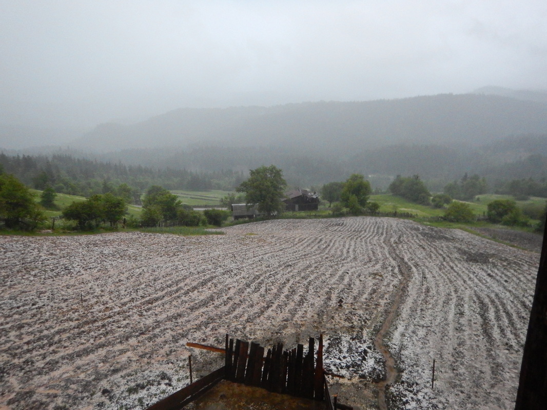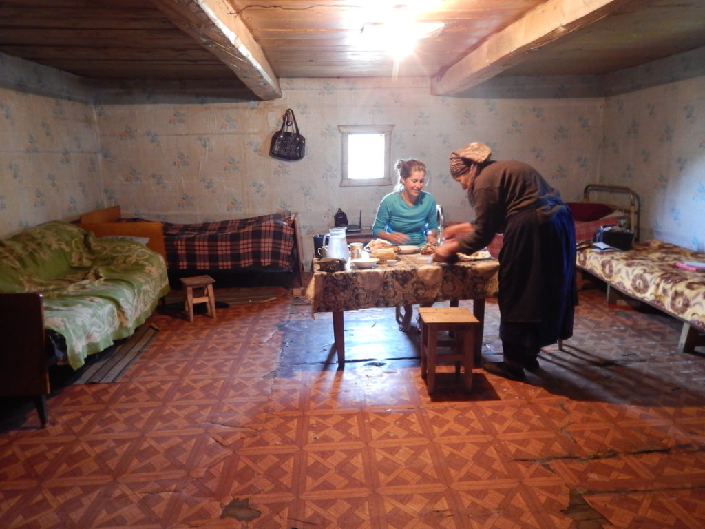 Siamo in una casa di una coppia di vecchietti contadini. L’arredamento è ridotto al minimo. Una singola stanza: al centro un tavolo, ai lati i letti, in un angolo l’immancabile stufa a legna, nell’altro la televisione, niente di più niente di meno. Sembra di aver fatto un tuffo nel passato e di rivivere i racconti di quando mia nonna era piccola e si viveva tutti nella stessa stanza. Siamo fradici e lungo il muro corre un filo dove mettiamo i panni ad asciugare al calore della stufa. Piatti di ferro e una brocca d’acqua per lavarsi le mani, anche qui non c’è l’acqua corrente in casa, le pentole si lavano in una bacinella. Lui è mussulmano e mentre fuori si scatena l’inferno, inizia a pregare e cantare a squarciagola sulla soglia del balcone. È in penombra che urla Allah Allah, la sua voce è coperta dal rumore della grandine battente che ormai ha colorato di bianco tutti i campi, fuori si intravede una verde foresta di pini all’imbrunire, un lampo illumina la sua figura ogni tanto, la scena è surreale!