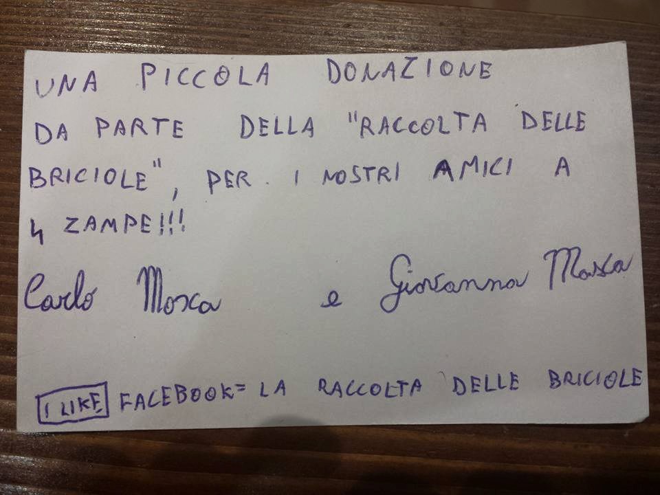 Giovanna e Carlo, a livello locale, nell’ambiente del volontariato, sono molto conosciuti e, come arrivano le richieste da parte di un attività o di un singolo, Giovanna disegna il salvabriciole (il barattolo per contenere i soldini) da fornire al richiedente. Alla raccolta fondi può partecipare chiunque, l’importante è raccogliere solo i centesimi di rame, senza “intrusi” come mi racconta (gli intrusi sarebbero dai 10 centesimi in sù). Non spediscono i salvabriciole, ognuno di noi può prepararne uno. “Sarebbe bello che si creasse una raccolta delle “briciole” in ogni regione, è inutile spedire i soldi a noi, costerebbe troppo, pochissimi euro possono essere molto pesanti. In tutte le città ci sono dei canili o dei gattili che hanno delle emergenze e dei volontari che si adoperano per gli animali. Non chiediamo soldi ma la condivisione di un’idea”.