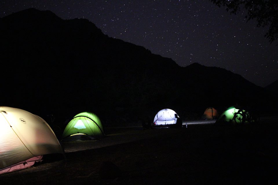 C’è chi per prima piazza la tenda, chi subito le sedioline, chi invece si fa da mangiare, io stendo il telo a terra e metto in pratica gli insegnamenti freschi freschi di yoga dei genitori di Tiph. Il buio cala che sono appena le 19:15, su di noi splende la via lattea. E vai con le foto in notturna. Prima di andare a nanna ne voglio fare una di gruppo. Come un direttore d’orchestra dirigo le luci che comporrano la foto: “ora!” e ognuno illumina dall’interno la propria tenda con la frontale, “ehh… stop!” le luci si spengono. Tempo che la macchina elabori la foto e l’immagine è pronta. “Hobi Kush”, sogni d’oro in tagiko.