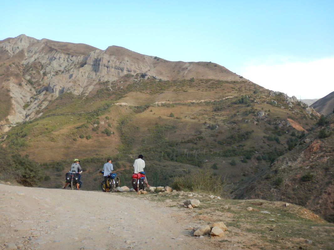Al posto di controllo, dove ci siamo dati appuntamento, le guardie hanno detto loro che due ciclisti erano passati lì un’ora fa e così Leonie e Philipp, che erano rimasti a Dushanbe mentre noi eravamo al centro agro-ecologico di Jafr, pensando che fossimo noi, si stavano affannando per raggiungerci. Arriviamo all’incrocio e vedo delle bici in lontananza. Il forte suono della mia nuova trombetta uzbeka li raggiunge rapidamente. Si girano, ci vedono, si fermano. Sono in compagnia di altri cicloturisti. Gli americani, che avevamo già conosciuto a Bukhara e degli australiani… ahh ma sì, ci conosciamo, ci siamo incrociati in Turchia 4 mesi fa, ci eravamo salutati con un “chissà forse ci vedremo sulla Pamir” e il destino vuole che ci incontriamo proprio qui, alle sue porte. 16 ruote, 8 cicloturisti, 5 nazionalità, 4 coppie: siamo una carovana!