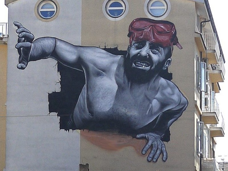 Dopo varie ricerche scopro che il murales è stato realizzato dall’artista MTO, e che a Sapri, in provincia di Salerno, si trova la seconda parte della stessa opera. In questa composizione si osserva lo stesso uomo di prima che, con fatica, esce dal buco in cui si trovava. Ecco svelato dove si stava muovendo: è un migrante in viaggio verso le coste italiane, in ricerca di pace e serenità.
