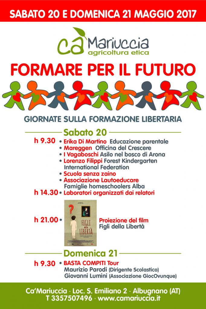 La cascina Ca’ Mariuccia ospita il 20 e 21 maggio l’incontro formare per il futuro, due giornate dedicate all’educazione libertaria con l’obiettivo di far conoscere modelli di formazione alternativi alla scuola tradizionale e dare voce alla consapevolezza di molte famiglie di volersi prendere la responsabilità di far crescere i propri figli all’interno di un etica e di un modo di pensare che forse sempre più non si trova nei modelli di scuola attuali.