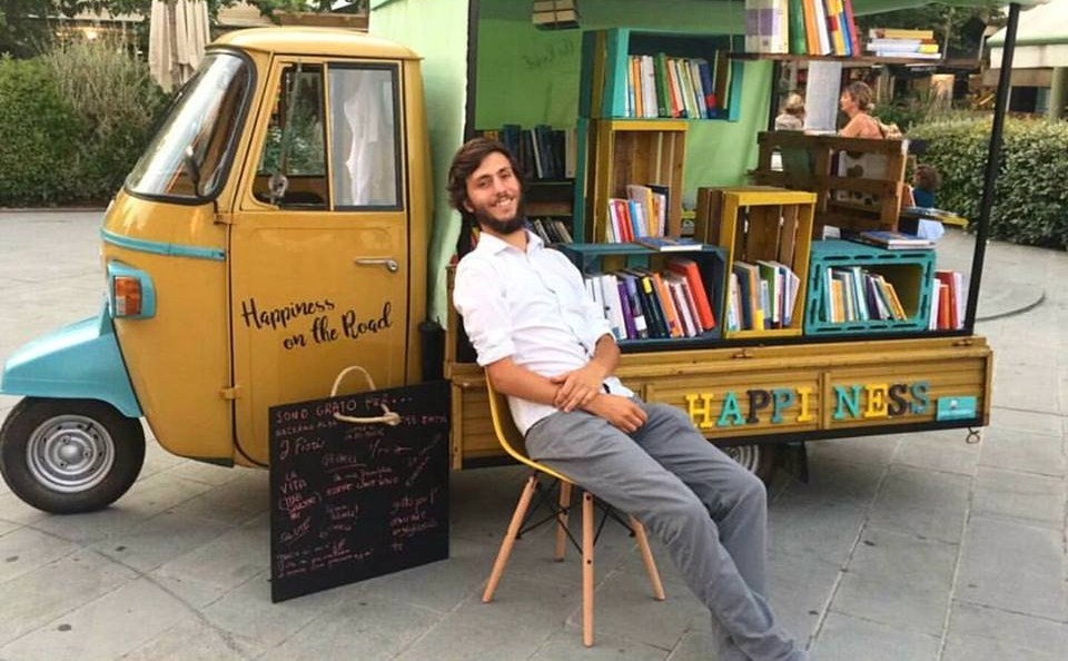 “Happiness on the road” è una libreria itinerante che parla di felicità e viaggia sulle ruote di una piccola ape car. Unendo la sua passione per i libri e gli studi di psicologia positiva, Marco Sacchelli ha dato vita a questa iniziativa nell’estate appena trascorsa, girando per le spiagge della Versilia a bordo del suo minivan.