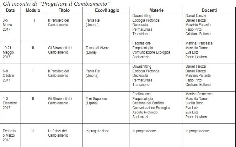 “Progettare il Cambiamento” non è rivolto solo a chi ha bisogno di consolidare una traccia personale già avviata, ossia a chi ha già smesso di credere alla capacità della vita tradizionale, stretta nella tenaglia città-lavoro-consumo, di generare felicità. Soprattutto, è rivolto a coloro i quali avvertono l’esigenza di cambiare la propria vita ma hanno ancora dubbi sull’origine di questo bisogno o sulla nuova direzione da prendere (a costoro consigliamo il modulo “Pensiero”), e a coloro che si chiedono come iniziare a mettere concretamente in pratica il progetto – associativo o imprenditoriale – che sognano (a costoro consigliamo i moduli “Strumenti” e “Azioni”).