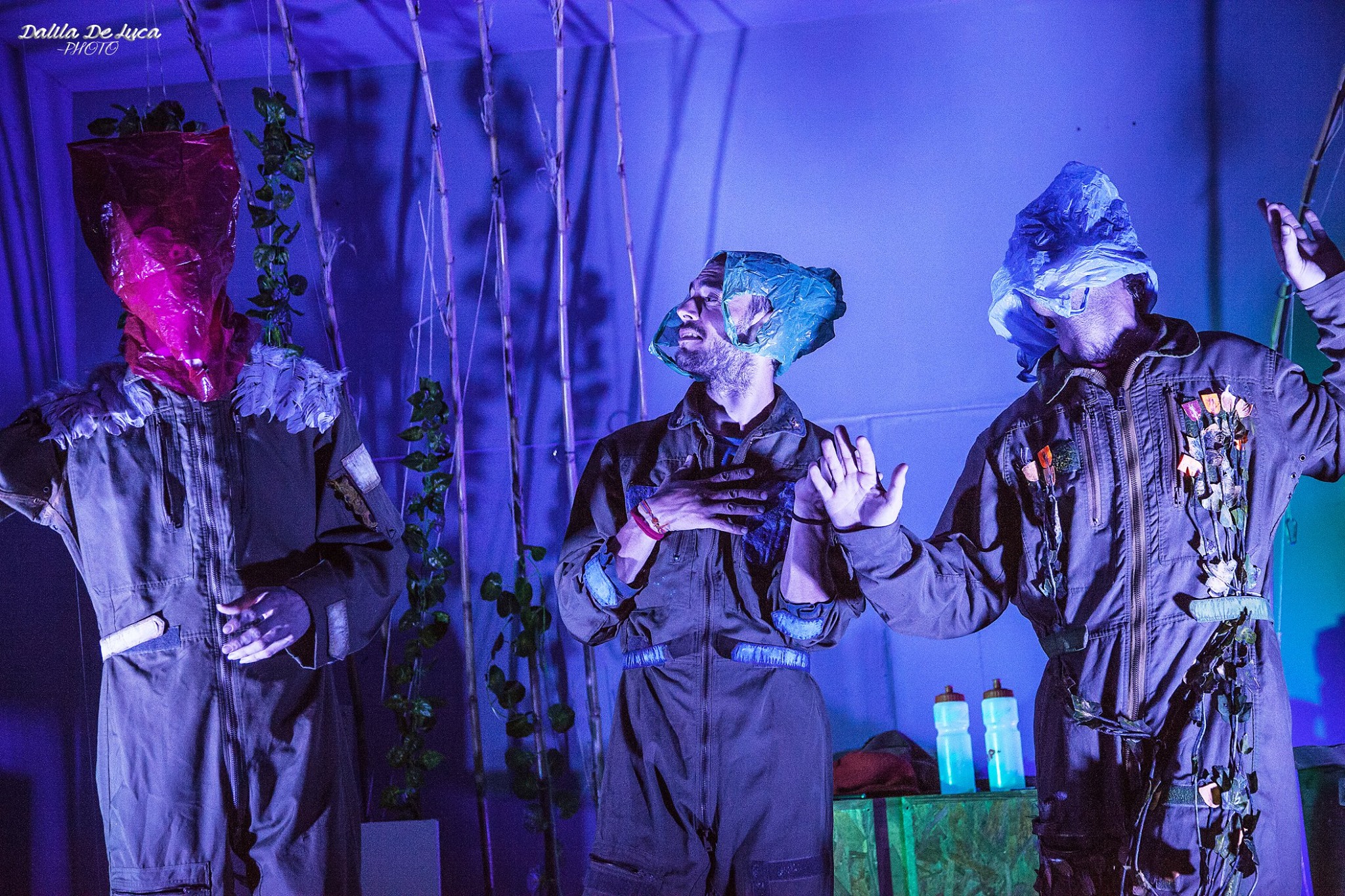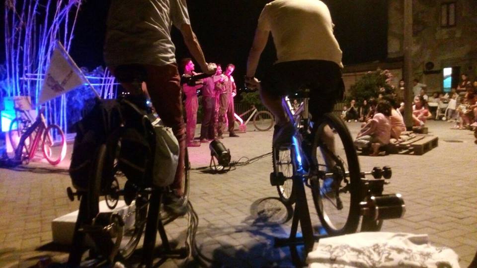 Durante la prima, quella siciliana di giugno, ci siamo serviti di un camper per il trasporto dell’attrezzatura necessaria per lo spettacolo, compresi i trasformatori di energia inventati da: Mobile Green Power, nostro partner: un sistema di produzione di energia che sfrutta la pedalata del pubblico. Durante lo spettacolo chiedevamo a due spettatori per volta di partecipare alla messinscena pedalando su delle bici poggiate sopra dei cavalletti. La loro forza muscolare alimentava gli accumulatori che ci servivano per la fonica e per le luci a led che consumano molto poco.