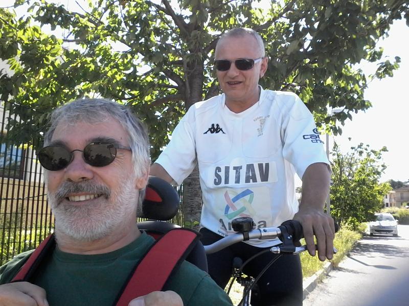 L’associazione aveva il mezzo che stavamo cercando (con scarsi risultati fino a quel momento): una bicicletta a pedalata assistita con una carrozzina per disabili agganciata davanti, dove io potevo stare seduto comodamente. Si sarebbero così potute percorrere le grandi distanze con la bici, ma all’occorrenza, giunti nei luoghi previsti, anche piccoli spostamenti sganciando la carrozzina dal mezzo.