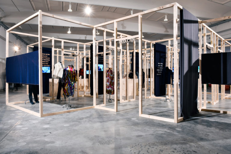 La mostra è composta da stazioni installative che si raccontano attraverso materiali informativo-documentari e capi di moda.