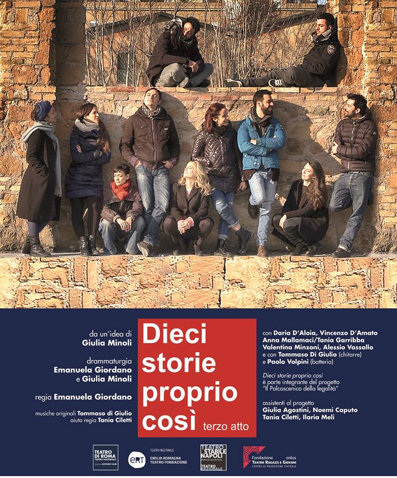 “Dieci storie proprio così. Terzo Atto” è parte integrante del progetto sperimentale “Il Palcoscenico della legalità” che nasce dalla progettualità tra Giulia Minoli, co-fondatrice di Co2 e Paolo Siani, fratello di Giancarlo Siani, giornalista vittima della Camorra. L’iniziativa nasce inizialmente sotto forma di spettacolo, consolidandosi successivamente in attività nelle scuole sul tema dell’educazione alla legalità. Queste ultime sono rivolte ai ragazzi dai 14 ai 18 anni e si sviluppano in laboratori gestiti ed organizzati in cooperazione tra attori e ricercatori universitari, che hanno saputo unificare la tecnica teatrale insieme ad attività di stampo didattico.