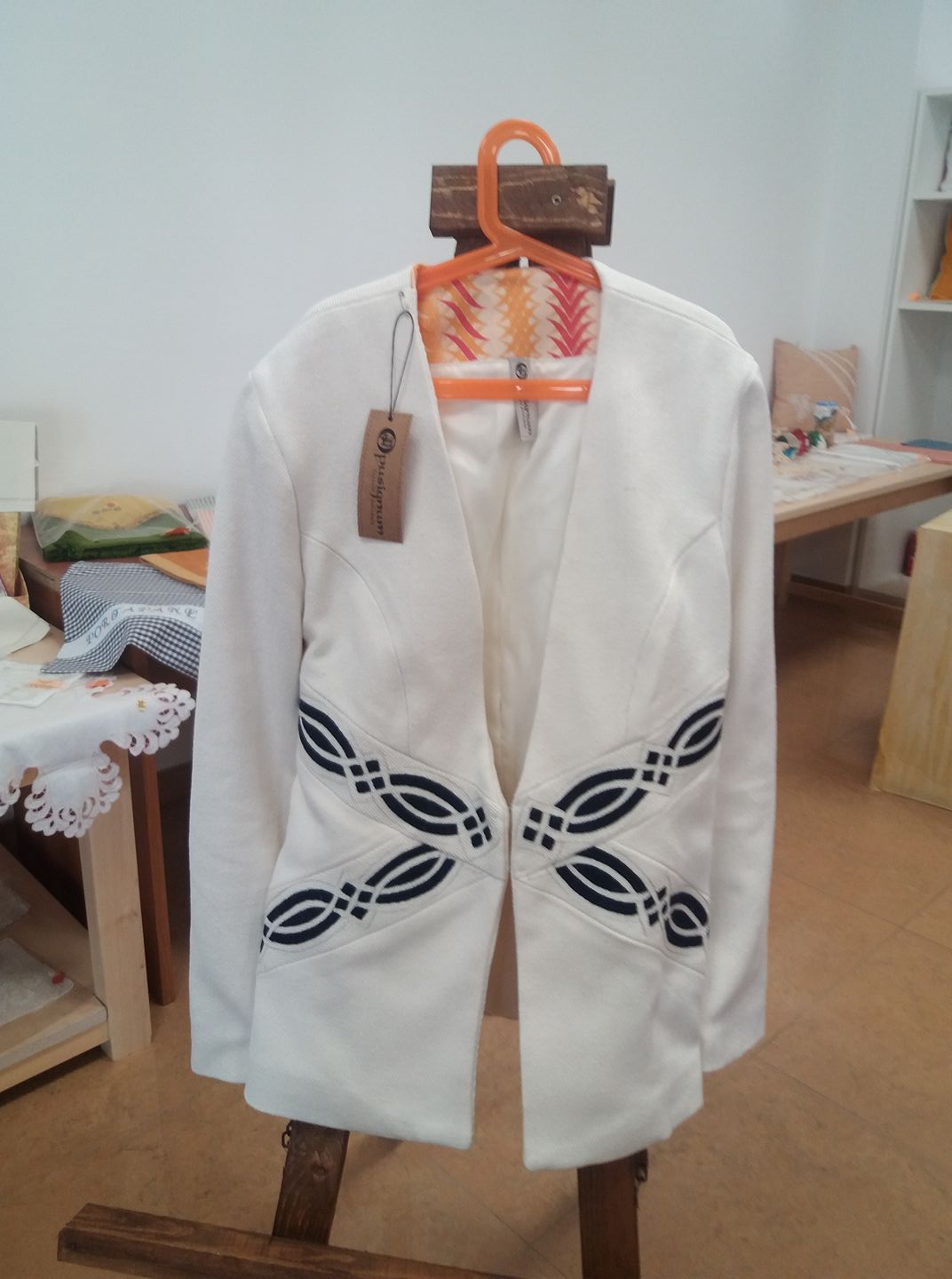 Giacca simbolo della filiera, lavorata in ginestra, ricamata a mano, con fodera in stoffa rigenerata