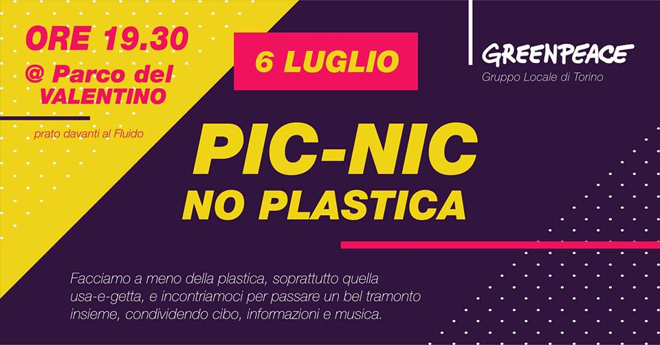 Al Parco del Valentino, nel prato di fronte al fluido, il Gruppo Locale Greenpeace di Torino organizza venerdì 6 luglio dalle 19,30 un Pic Nic No Plastica, un appuntamento per ricordarsi che in tante occasioni possiamo fare a meno della plastica, soprattutto quella usa-e-getta, e per incontrarsi condividendo cibo, informazioni, musica. Durante la serata saranno presenti due ospiti relatori che parleranno dell’impatto ambientale della plastica e delle soluzioni creative che si stanno inventando in ogni angolo del Globo per farne a meno.