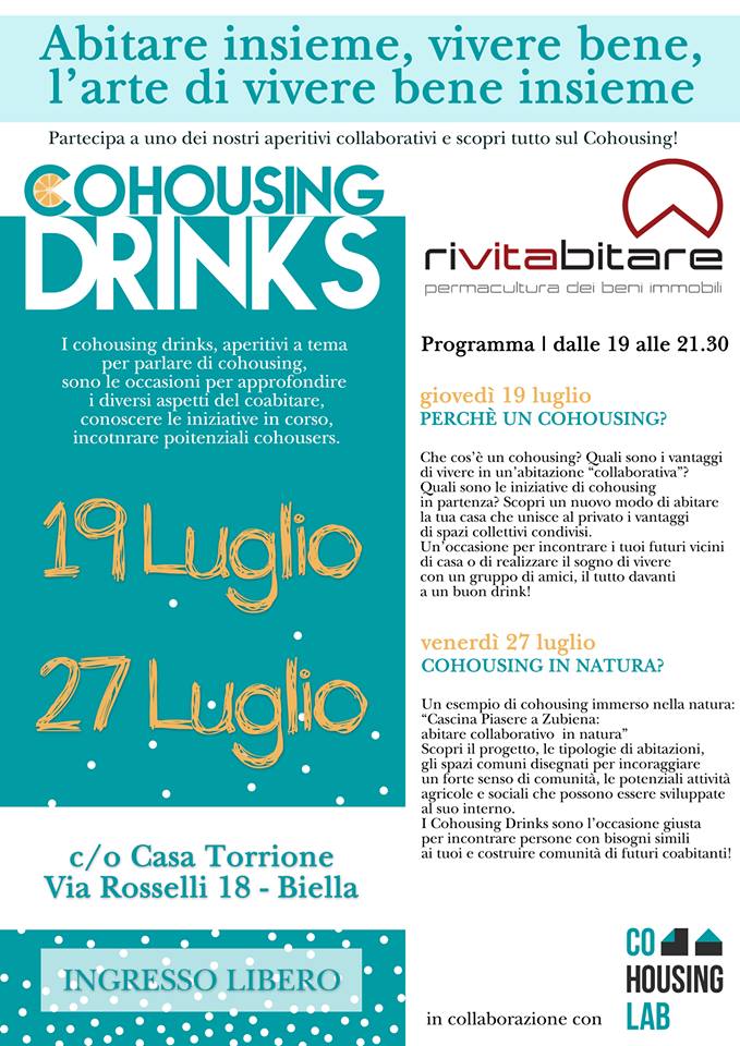 Chi vuole saperne di più, si sente incuriosito dall’arte di vivere insieme, dubbioso o alla ricerca di nuove forme di abitare non potrà mancare ai due aperitivi a tema “Cohousing Drinks” previsti il 19 e il 27 luglio dalle 19 alle 21:30 presso Casa Torrione in Via Rosselli 18 a Biella. Sarà l’occasione per scoprire i diversi aspetti dell’abitare collaborativo, i potenziali di questo progetto e incontrare persone con cui condividere sogni, bisogni e senso di comunità.
