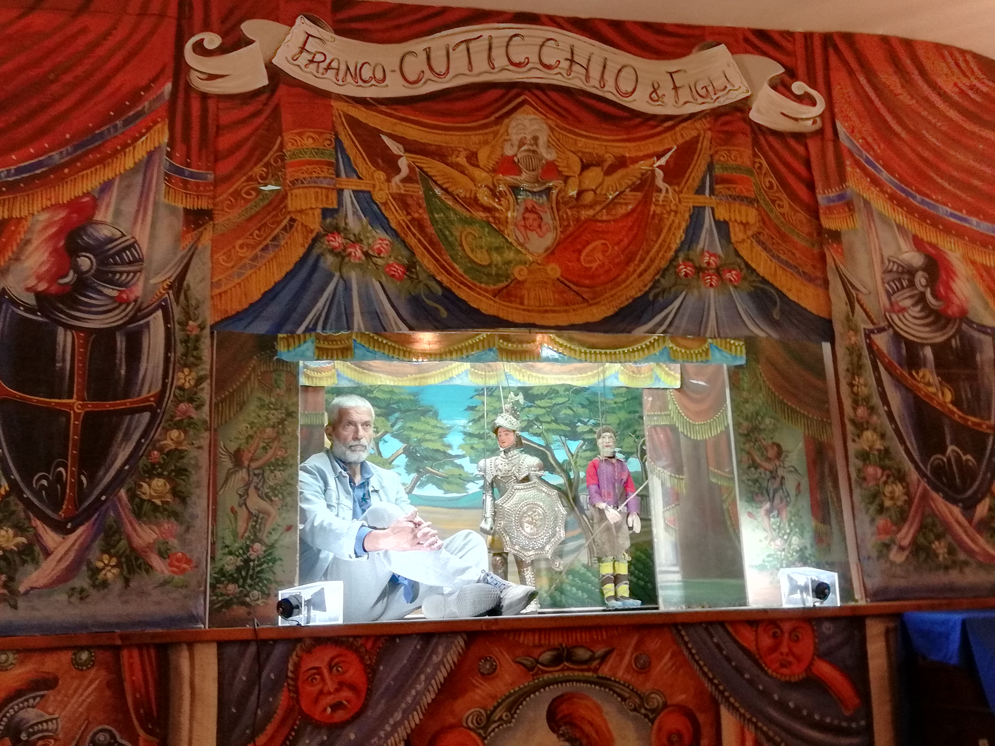 “La nostra famiglia, da quasi quattro generazioni, rappresenta il Teatro dei Pupi in Sicilia e nel resto del mondo, dato che siamo andati anche all’estero per esibirci. Siamo una famiglia di quattro maschi e una femmina e facevamo e facciamo questo amato mestiere: già, alcuni non lo fanno più per motivi vari, però abbiamo sempre i pupi nel cuore e nell’anima perché i nostri giocattoli sono stati loro, la mia casa era piena di teste, ossatura, costumi, armature, scene”. Carmelo, detto Mimmo, Cuticchio è il fratello di Franco Cuticchio, ed è insieme la voce dell’amore, dell’emozione e della tristezza di questo teatro palermitano: mentre ci parla, osserviamo i volti dei Pupi seduti vicino a lui, gli occhi sbarrati, immobili ma che sembrano prendere vita insieme all’ardore e alla rabbia di Carmelo.