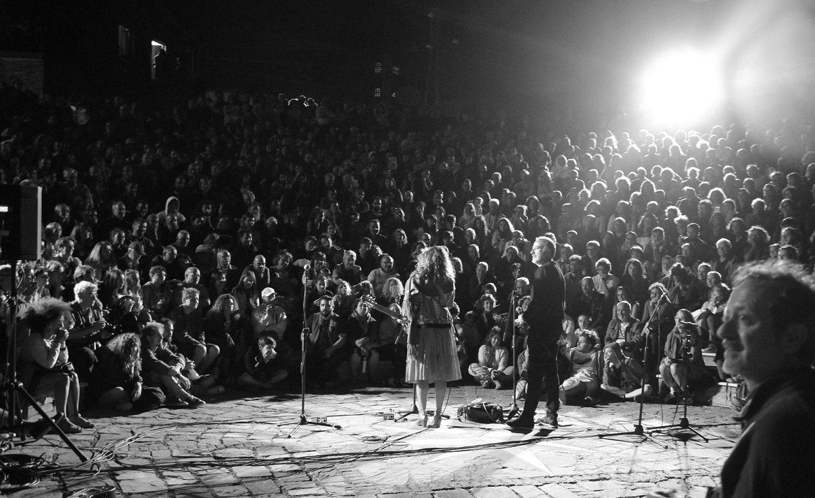 Franco Arminio – che del festival non è soltanto l’ideatore ma anche il curatore, presentatore e direttore – è particolarmente capace a cogliere il momento e capire quale direzione prendere: se rispettare i tempi del programma o, più di frequente, ritardarli (cosa che qui non produce proteste, ma opportunità); se dare spazio a chi si propone in quel momento o ascoltare i commenti del pubblico, col quale riesce sempre a dialogare con grande facilità. “Volete fare l’alba?” è la domanda che cala dal palco tutte le notti, che l’alba sia “necessaria” o “facoltativa”, ossia prevista o meno nel programma. E la piazzetta Panevino, il piccolo e raccolto salotto architettonico nel quale si succedono gli eventi notturni e nel quale è, di fatto, annullata la distanza tra spettatori e artisti, non fa che facilitare questa interazione.