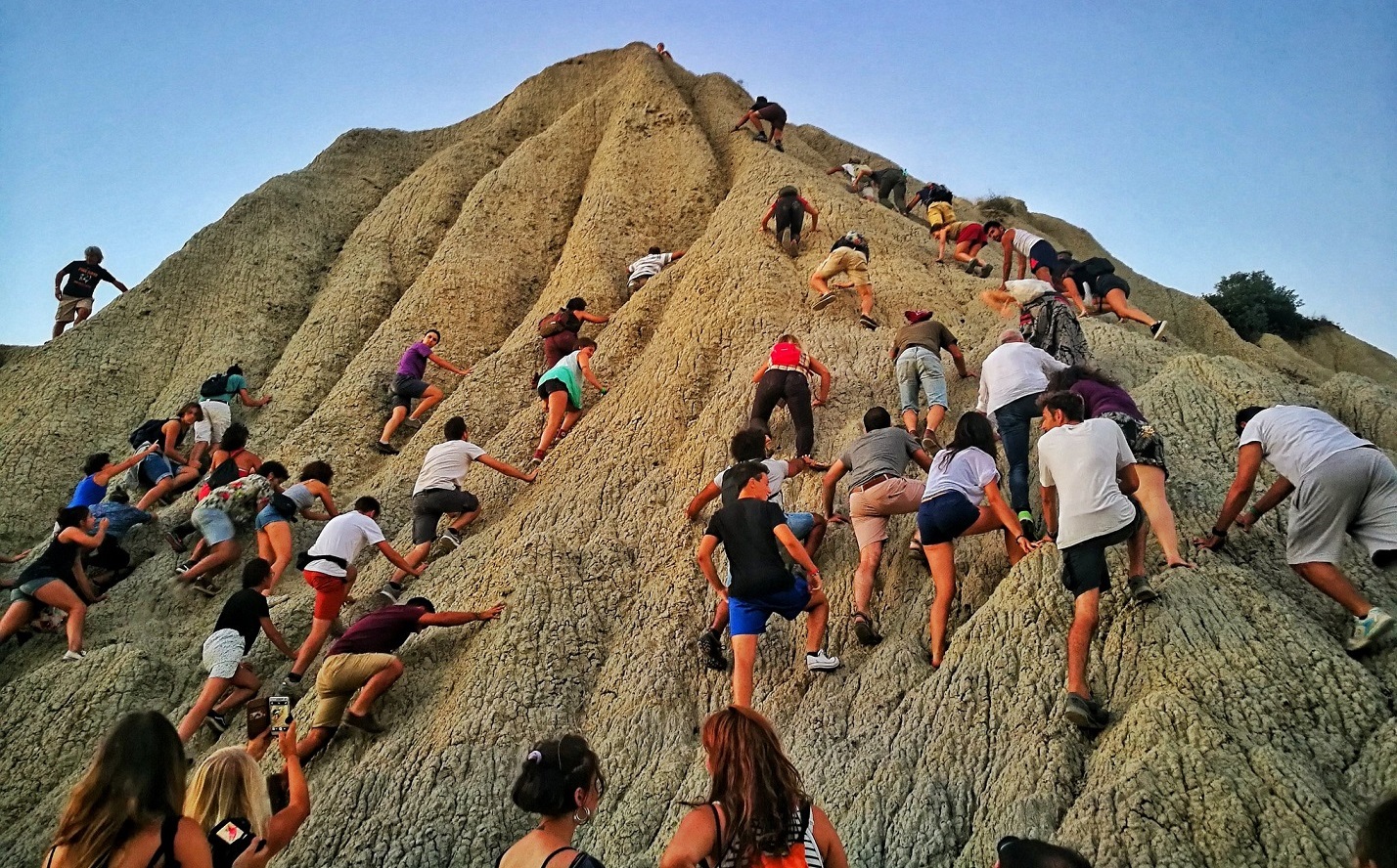 Eppure, qualsiasi sia la risposta alla fatidica domanda della notte, un’alba, quella della domenica, è obbligata per tutti. E lo scenario è di quelli che raramente un luogo diverso da Aliano potrebbe accogliere con altrettanta potenza. L’ultima passeggiata ai calanchi inizia tra le 4 e le 5 del mattino, con il senso di comunità a farla ancora da protagonista. Tutti coloro che sono forniti di mezzi propri si prodigano per offrire un passaggio a chi invece si è incamminato a piedi. Sono 5 i km che separano il centro abitato dallo spettacolo che il tempo ha modellato nei secoli pennellando strapiombi improvvisi di un bianco accecante e di lunare bellezza. Una scenografia naturale perfetta per celebrare – fra arpe, flauti, canti solitari e talvolta pecore – gli ultimi riti di trasformazione di migliaia di perfetti sconosciuti… in complici.