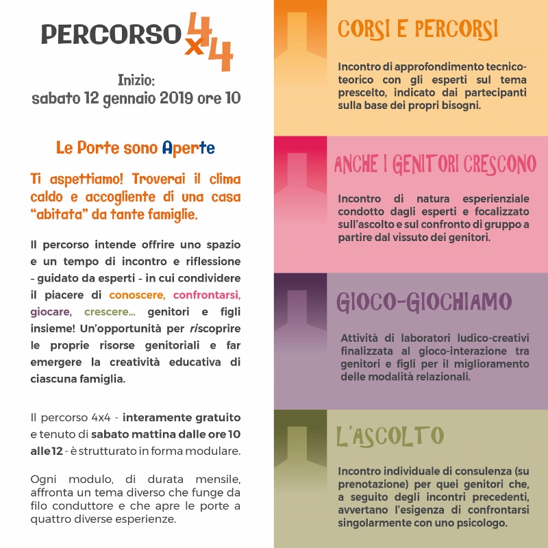 Sabato dunque il percorso verrà illustrato in un incontro pubblico, l’inizio del percorso sarà invece sabato 12 gennaio sempre alle 10 nel la nuova sede della Fondazione a Bibbiena in Via Bosco di Casina 12. Il percorso 4×4 è tenuto dai professionisti del Nuovo Laboratorio di Psicologia di Arezzo (psicologhe psicoterapeute sistemico-relazionali) dott.sse Stefania Ballerini, Claudia Bernardini, Maria Teresa Fantacchiotti e Francesca Nofri.
