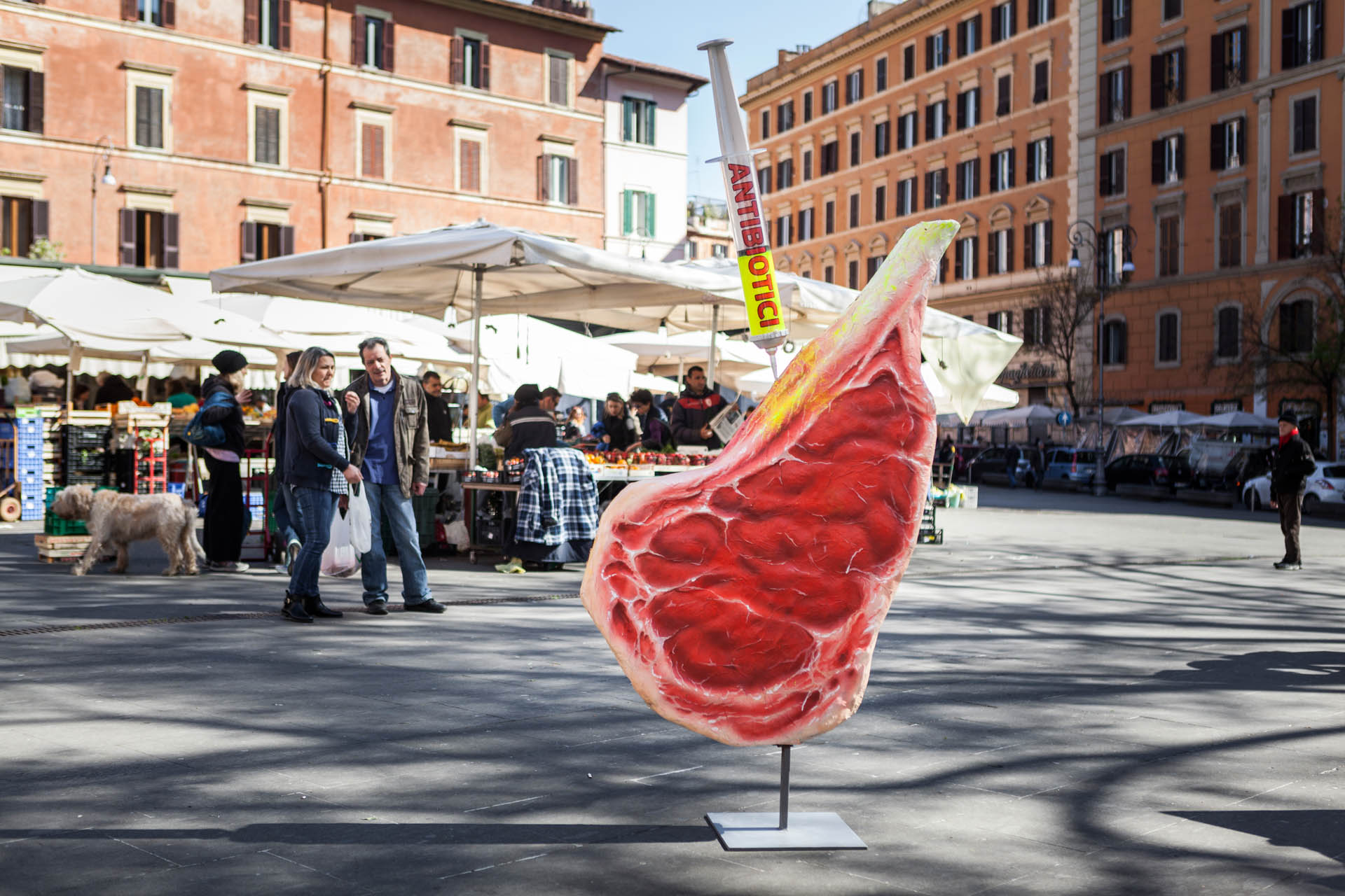 Davanti ad una gigantesca bistecca con dentro una siringa di antibiotici Greenpeace ha manifestato oggi a Roma in piazza San Cosimato. Contemporaneamente i volontari dell’associazione ambientalista sono scesi nelle piazze di 25 città italiane con lo slogan “All you can M-Eat”, invitando i passanti a provare il “Menu PAC-co degli allevamenti intensivi”: Una lista di specialità invisibili di cui ci “nutriamo”, dall’insalata di nitrati alla zuppa di liquami. Obiettivo: denunciare un sistema di produzione alimentare insostenibile foraggiato anche dai soldi pubblici della Politica Agricola Comune (PAC), che rappresenta circa il 40 per cento del bilancio annuale europeo.