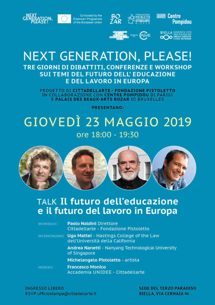 La tre giorni prenderà il via alle 14.30 in Sala Cervo con al presentazione del Manuale Metodologico Inside – Outside realizzato dal gruppo di lavoro Next Generation, Please!, che vedrà intervenire Ruggero Poi (Ufficio Ambienti di Apprendimento e Scuole Cittadellarte) e Marco Cagnolati (BOZAR Centre For Fine Arts Bruxelles). Alle 15, il programma continua con l’introduzione ai tre gruppi di workshop con expertises dei settori dell’educazione e del lavoro, che saranno a cura di Andrea Nanetti (Nanyang Technological University of Singapore), Juan Sandoval (direttore Ufficio Arte di Cittadellarte), Ruggero Poi e Marco Liberatore (gruppo Ippolita). Alle 17.30, alla sede del Terzo Paradiso, è poi prevista la restituzione laboratoriale dei ragazzi della Scuola Secondaria di I grado ‘D. Alighieri’ di Opera (MI). Dalle 18:00 alle 19:30, infine, sempre alla sede permanente del Terzo Paradiso, si terrà il talk aperto al pubblico intitolato “Il futuro dell’educazione e il futuro del lavoro in Europa”. Dopo l’introduzione di Paolo Naldini (direttore di Cittadellarte) interverranno i seguenti relatori: Michelangelo Pistoletto, Ugo Mattei (Hastings College of the Law dell’Università della California) e Andrea Nanetti. L’incontro sarà moderato da Francesco Monico (Accademia UNIDEE – Cittadellarte).