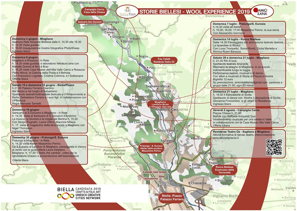 Da giugno a ottobre, in occasione dell’apertura della Rete Museale Biellese, saranno numerosi gli eventi che coinvolgeranno i Comuni di Biella e Ronco, oltre che diversi territori della Valle Cervo quali Pralungo, Rosazza, Campiglia Cervo e Miagliano. In particolare, il progetto dell’Associazione Storie di Piazza dal nome “Storie Biellesi” , si intersecherà con quello di “Wool Experience” di Amici della Lana.